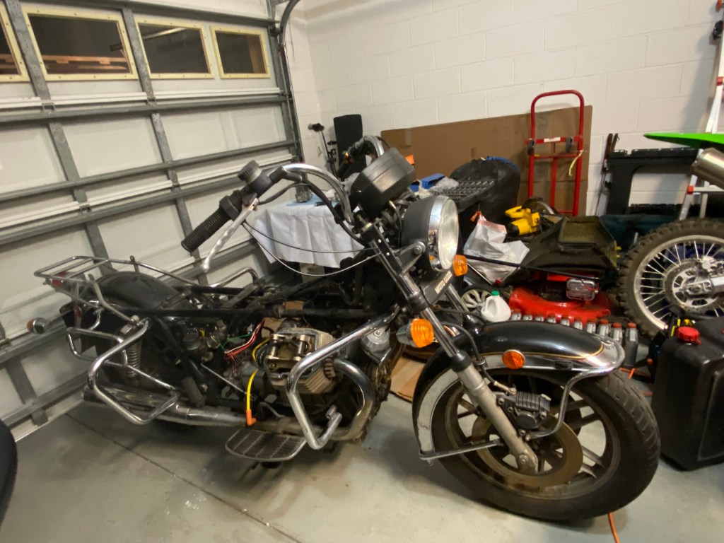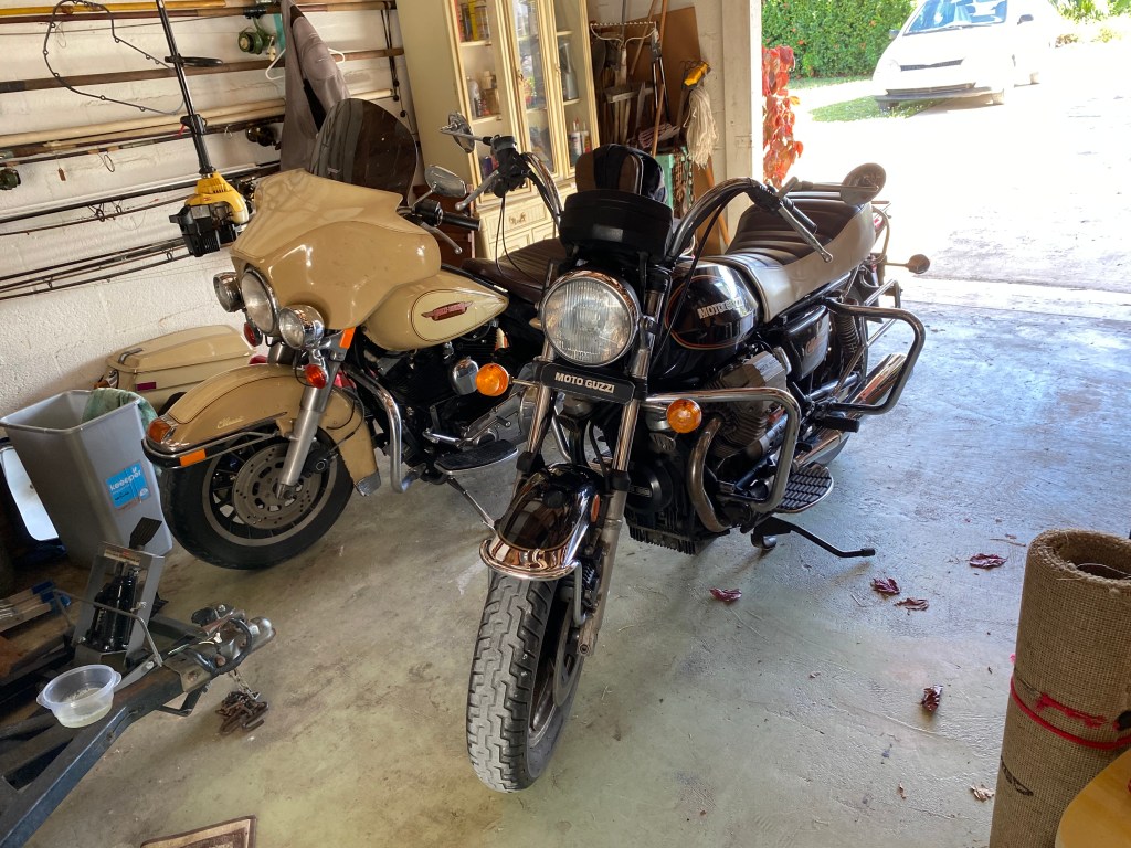 The Guzzi and the Harley in pops garage. He still rides often, and the Guzzi will come back to me once he finally retires his riding boots…I have a feeling that won’t be for a while (God willing)!