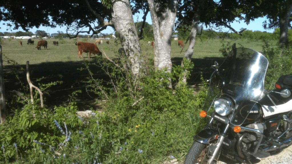The old Guzzi has been all over the country! Here she is on some back road in central TX.