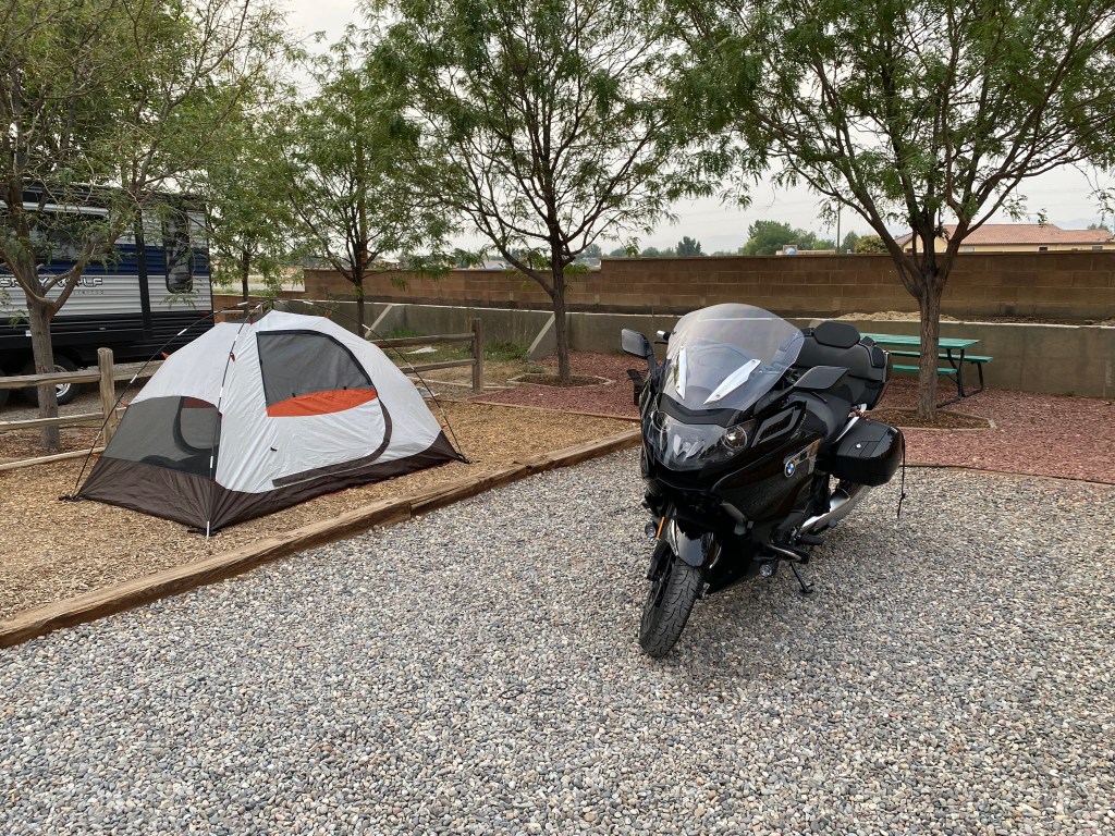 After dinner I rode a few blocks until I reached the entrance to the KOA. I checked in, set up my tent, and cleaned the bugs off the BMW along with my Shoei. It was a great first day!