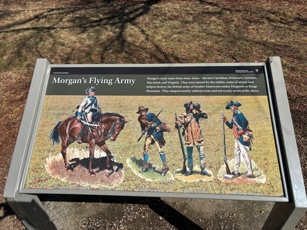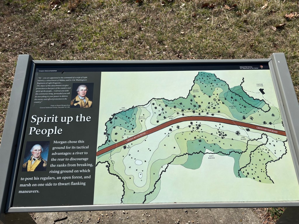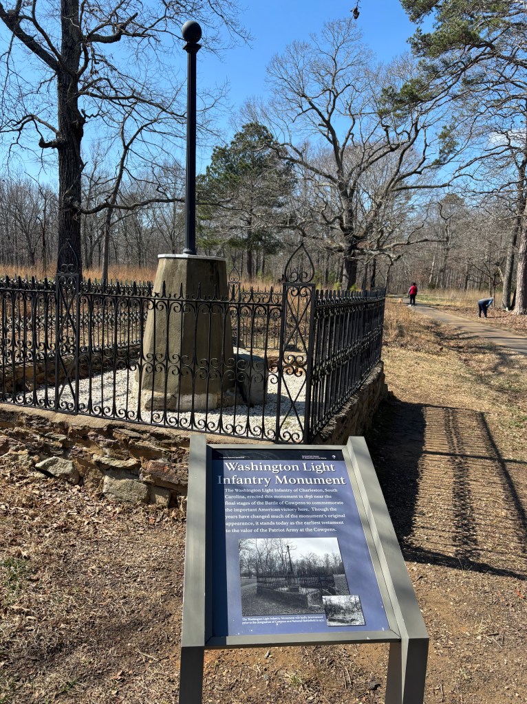The Cowpens National Battlefield Monument/Park is tucked between the town of Cowpens and Gaffney. The park does a really nice job outlining the timeline and the exact locations of the battle as it unfolded.