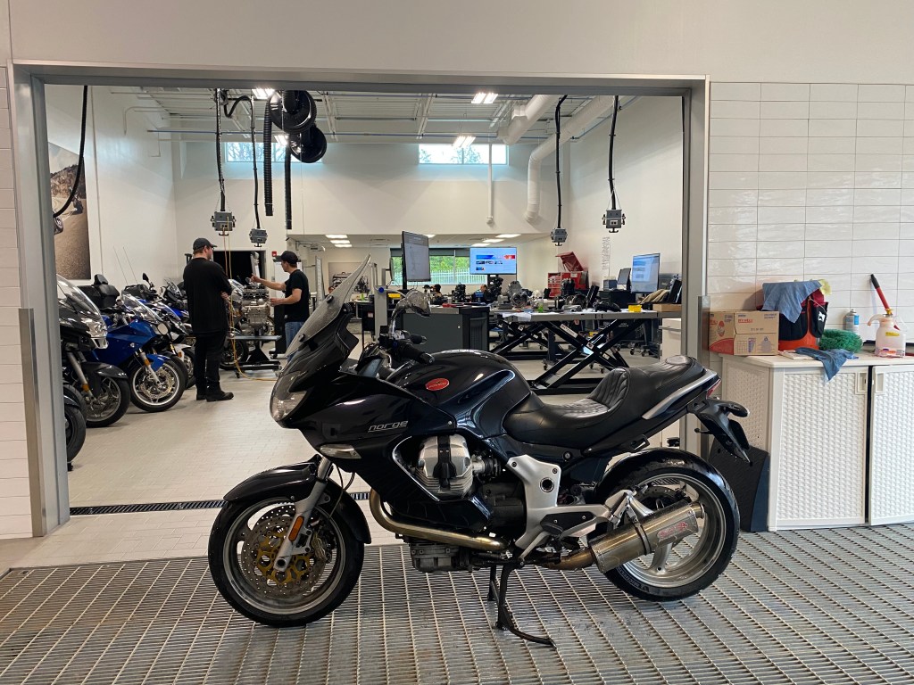 The BMW staff allowed the Guzzi to be parked indoors while it rained.