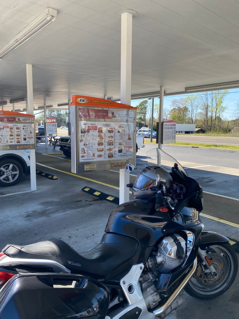 I took the back roads all the way to Augusta before stopping for a late lunch at an Olive Garden. After filling up on pasta and breadsticks I filled the Guzzi up and hit the road again. My next stop was the hotel in Atlanta.